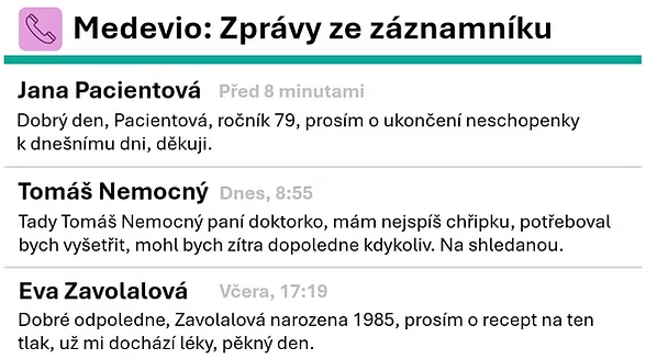 Personál ordinace nemůže zvednout příchozí hovor. Ten je automaticky přesměrován na chytrou ústřednu, která pacientovi umožní nahrát vzkaz a přepíše jej do Medevia. Personál okamžitě vidí kdo volal a jaký je jeho požadavek. Ten vyřídí